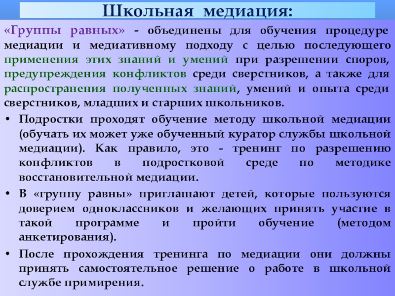 обеспечение формирования и обучения «групп равных» («группы равных» - это группы детей, которые объединены для обучения процедуре медиации и медиативному подходу с целью последующего применения этих знаний и умений при разрешении споров, предупреждения конфликтов среди сверстников, а также для распространения полученных знаний, умений и опыта среди сверстников, младших и старших школьников);