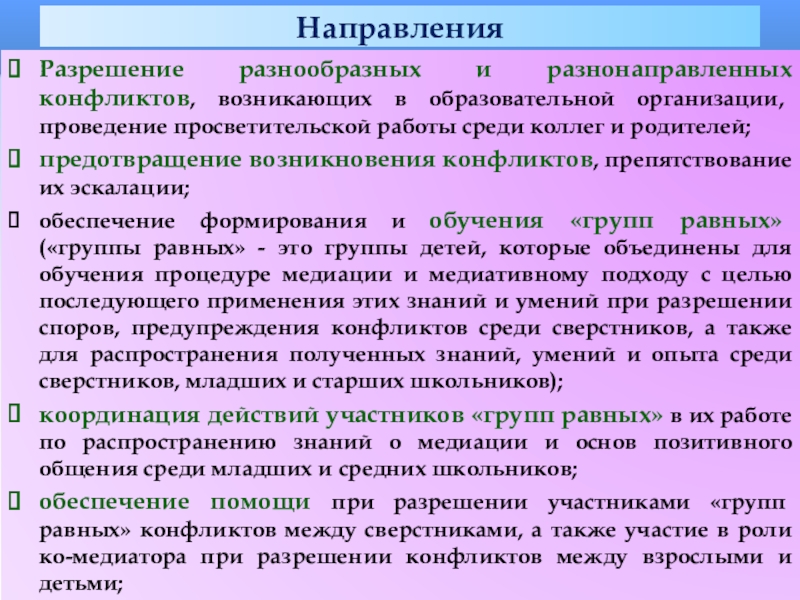 подходу с целью последующего применения этих знаний и умений при разрешении споров, предупреждения конфликтов среди сверстников, а также для распространения полученных знаний, умений и опыта среди сверстников, младших и старших школьников.