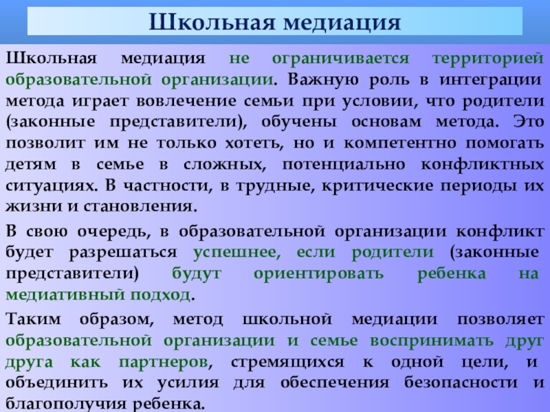 Таким образом, метод школьной медиации позволяет образовательной организации и семье воспринимать друг друга как партнеров, стремящихся к одной цели, и объединить их усилия для обеспечения безопасности и благополучия ребенка.
