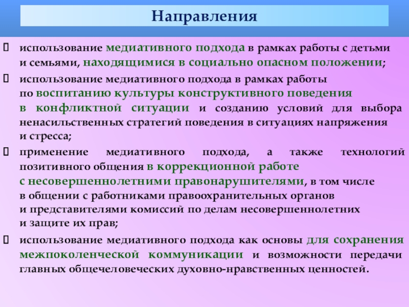 использование медиативного подхода как основы для сохранения межпоколенческой коммуникации и возможности передачи главных общечеловеческих духовно-нравственных ценностей.