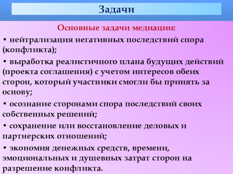 Основные задачи медиации: