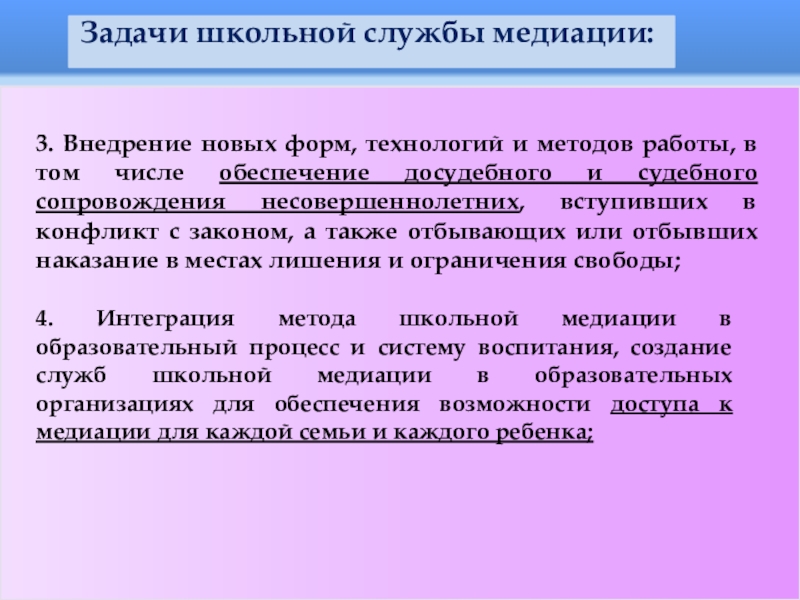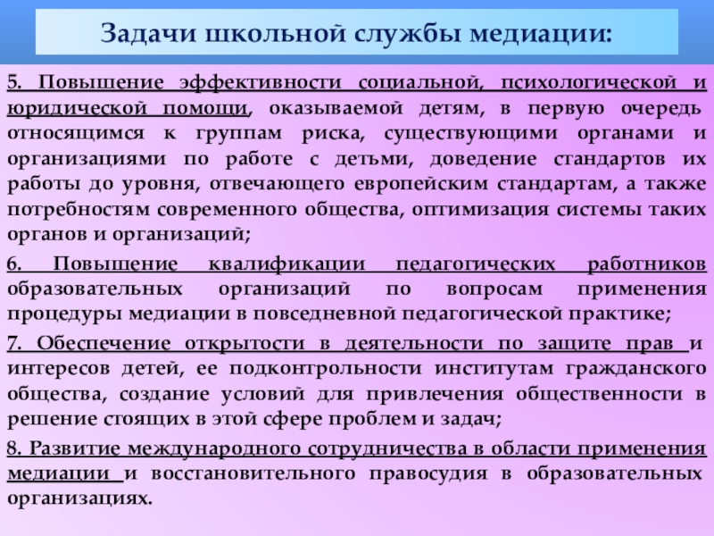 4. Интеграция метода школьной медиации в образовательный процесс и систему воспитания, создание служб школьной медиации в образовательных организациях для обеспечения возможности доступа к медиации для каждой семьи и каждого ребенка;