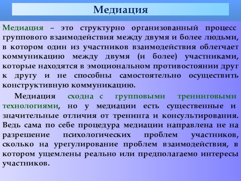 Медиация – это структурно организованный процесс группового взаимодействия между двумя и