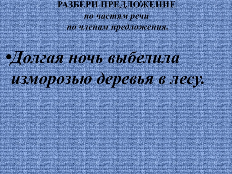 РАЗБЕРИ ПРЕДЛОЖЕНИЕ по частям речи  по членам предложения.  Долгая ночь выбелила изморозью деревья в лесу.