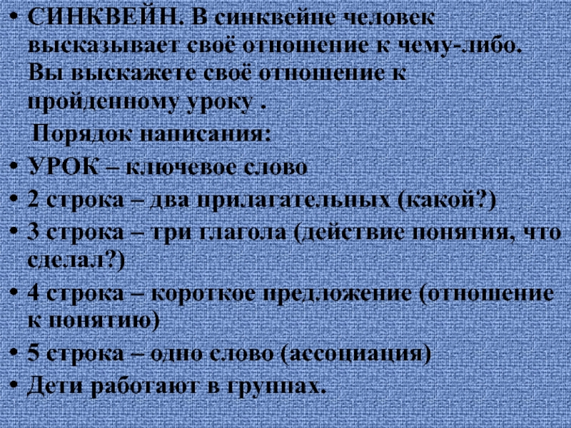 СИНКВЕЙН. В синквейне человек высказывает своё отношение к чему-либо. Вы выскажете своё отношение к пройденному уроку .