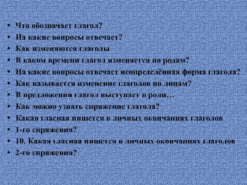 Что обозначает глагол?На какие вопросы отвечает?Как изменяются глаголыВ каком времени глагол изменяется по родам?На какие вопросы отвечает