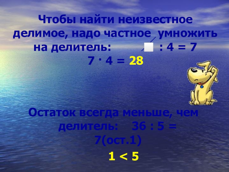 Остаток всегда меньше, чем делитель: 36 : 5 = 7(ост.1)