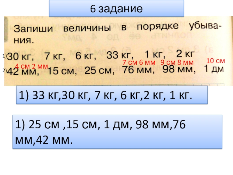 1) 25 см ,15 см, 1 дм, 98 мм,76 мм,42 мм.