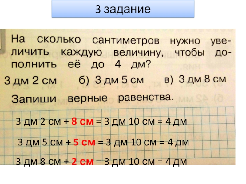 3 дм 8 см + 2 см = 3 дм 10 см = 4 дм