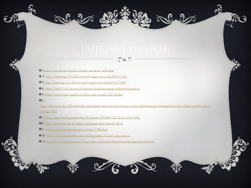 Интернет-ресурсы:1.http://vasnec.ru/jivopis/jivopis_vasnecov_a58.php 2. http://learning.9151394.ru/mod/page/view.php?id=4775213.http://learning.9151394.ru/mod/page/view.php?id=477468 4. http://velo17.ru/istoriya-lyitkarino/belokamennyie-skulpturyi-moskvyi5. http://www.super-guide.ru/index.php-section_ID=8.htm6. http://litrix.ru/city/238-oboi-dlya-rabochego-stola-moskva-hram-vasiliya-blazhennogo-i-fotografii-moskva-hram-vasiliya-blazhennogo.html7. http://picasaweb.google.com/lh/photo/SlNhdCZ8f-LSxU-yHNyXPg8. http://www.oskole.sk/pages/printpage.php?clanok=68549. http://www.panoramio.com/photo/2250366610. http://www.multylinks.net/ru/blog/plot/102269/msu/news/11.http://www.socio.msu.ru/?start_from=20&ucat=&archive=&subaction=&id=&