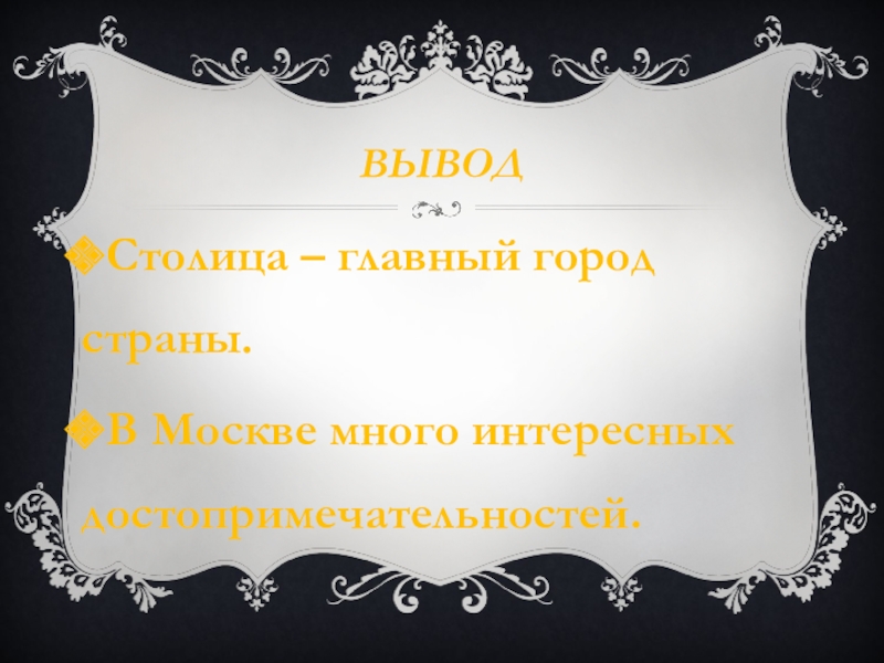 ВЫВОДСтолица – главный город страны.В Москве много интересных достопримечательностей.