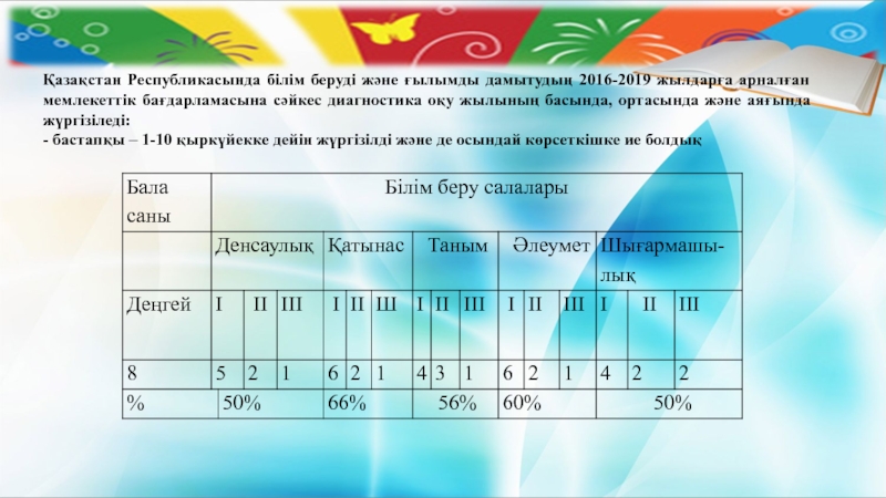Қазақстан Республикасында білім беруді және ғылымды дамытудың 2016-2019 жылдарға арналған мемлекеттік бағдарламасына сәйкес диагностика оқу жылының басында, ортасында және аяғында жүргізіледі: