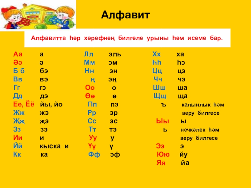Алфавитта һәр хәрефнең билгеле урыны һәм исеме бар.