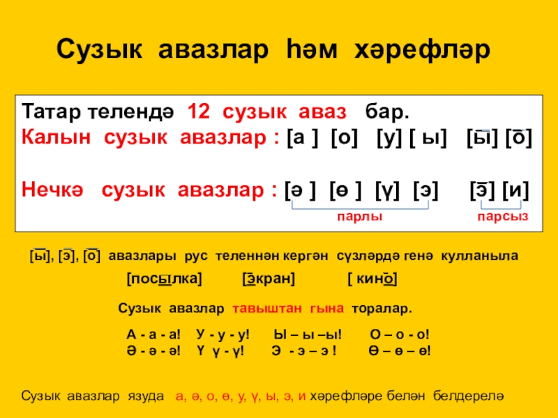 Сузык авазлар язуда а, ә, о, ө, у, ү, ы, э, и хәрефләре белән белдерелә