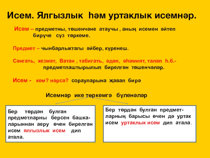 Бер төрдән булган предметларны берсен башка-ларыннан аеру өчен бирелгән исем ялгызлык исем дип атала.