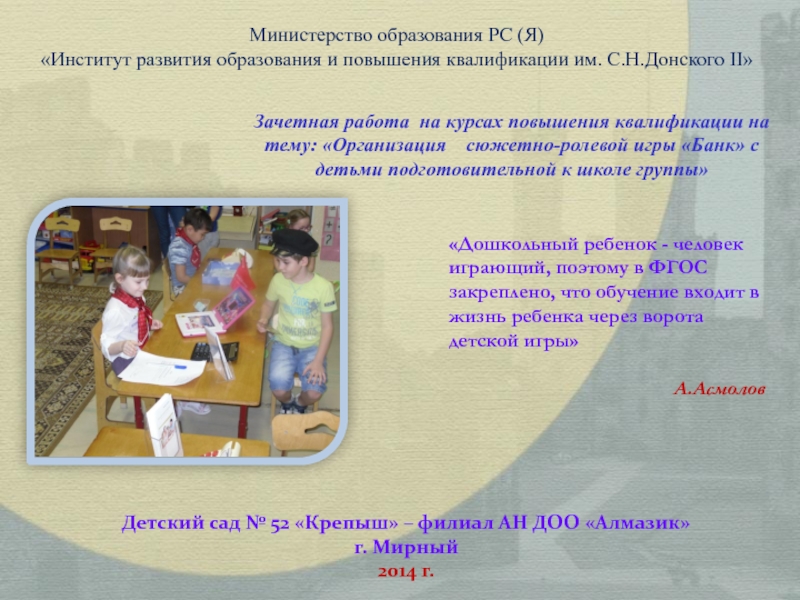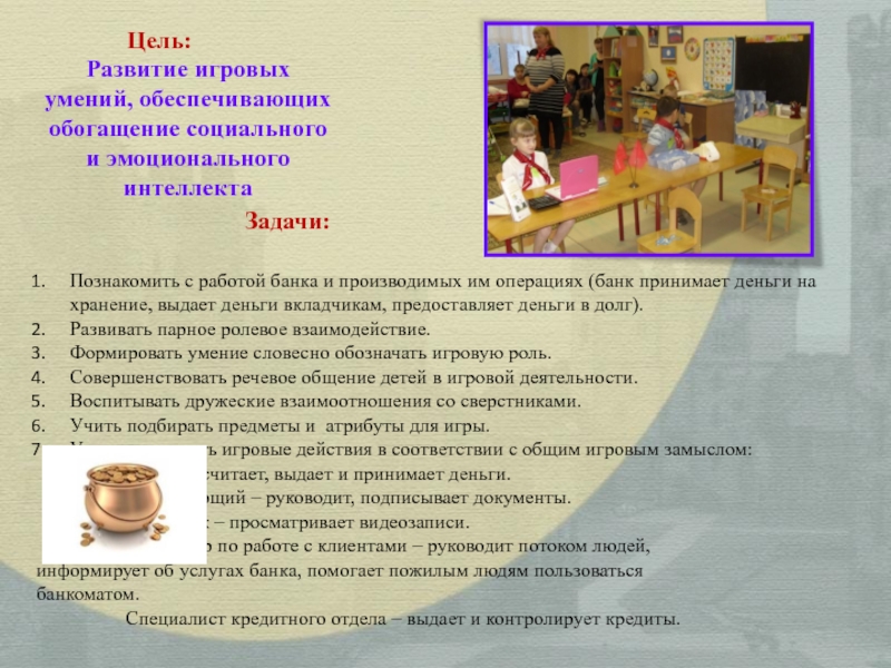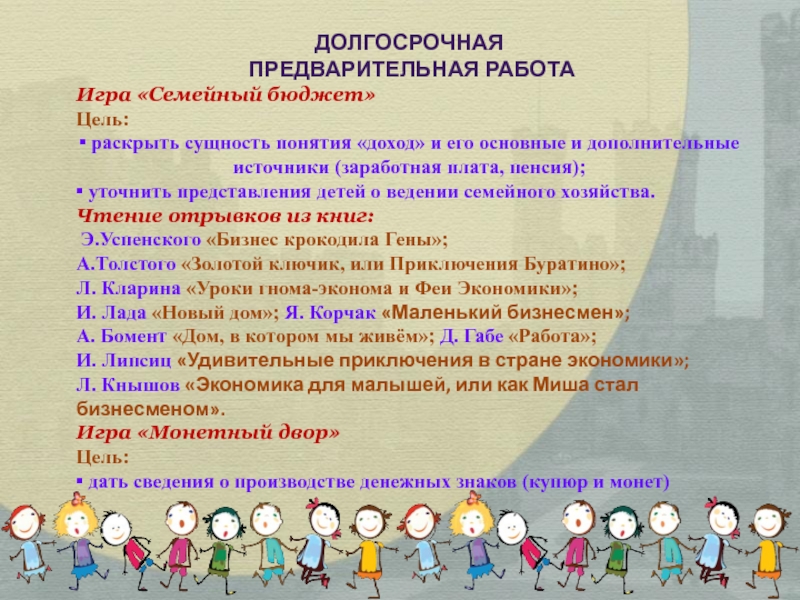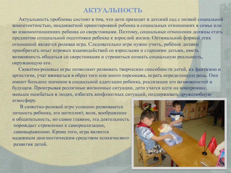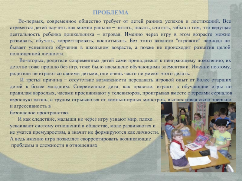 достижений. Все стремятся детей научить как можно раньше – читать, писать, считать, забыв о том, что ведущая деятельность ребенка дошкольника – игровая. Именно через игру в этом возрасте можно развивать, обучать, корректировать, воспитывать. Без этого важного "игрового” периода не бывает успешного обучения в школьном возрасте, а позже не происходит развития целой полноценной личности.