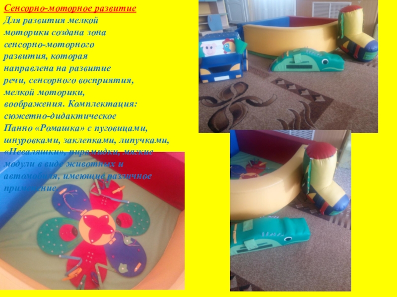 «Неваляшки», пирамидки, мягкие модули в виде животных и автомобиля, имеющие различное применение.