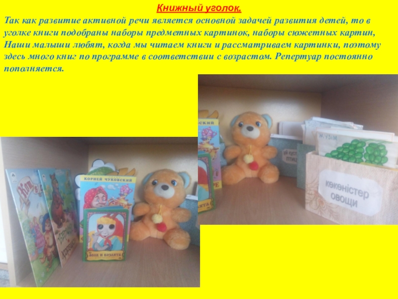 уголке книги подобраны наборы предметных картинок, наборы сюжетных картин, Наши малыши любят, когда мы читаем книги и рассматриваем картинки, поэтому здесь много книг по программе в соответствии с возрастом. Репертуар постоянно пополняется.