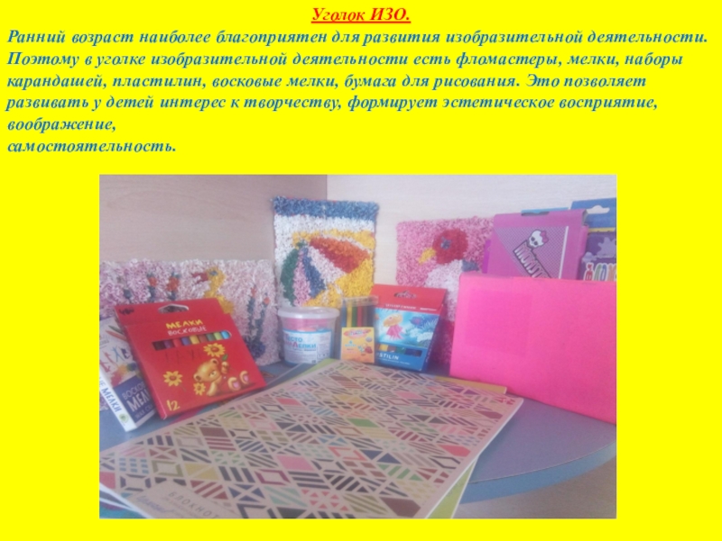 уголке изобразительной деятельности есть фломастеры, мелки, наборы