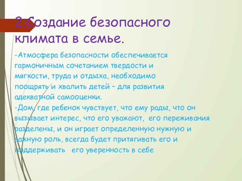 2.Создание безопасного климата в семье.-Атмосфера безопасности обеспечиваетсягармоничным сочетанием твердости имягкости, труда и отдыха, необходимопоощрять и хвалить детей