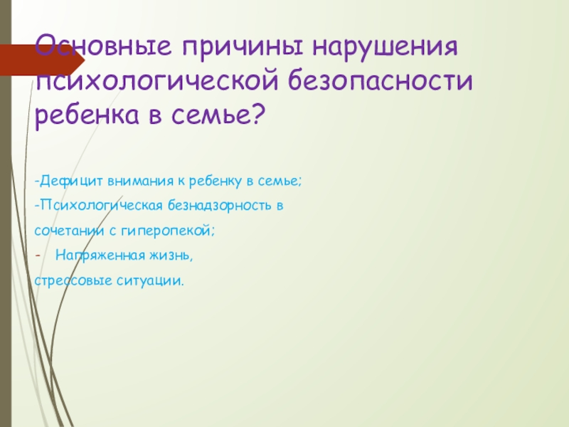 Основные причины нарушения психологической безопасности ребенка в семье? -Дефицит внимания к ребенку в семье;-Психологическая безнадзорность всочетании с