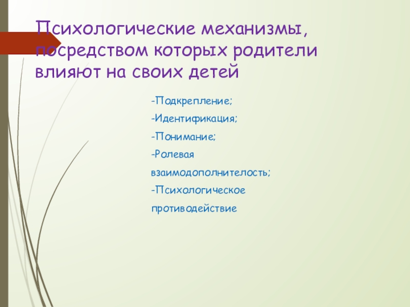 Психологические механизмы, посредством которых родители  влияют на своих детей-Подкрепление;-Идентификация;-Понимание;-Ролеваявзаимодополнителость;-Психологическоепротиводействие