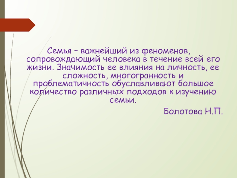 Семья – важнейший из феноменов, сопровождающий человека в течение всей его жизни. Значимость ее влияния на личность, ее сложность, многогранность и проблематичность обуславливают большое количество различных подходов к изучению семьи.Болотова Н.П.