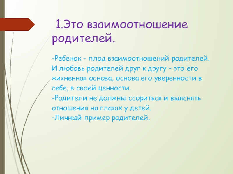 1.Это взаимоотношение родителей.-Ребенок - плод взаимоотношений родителей.И любовь родителей друг к другу - это егожизненная основа,