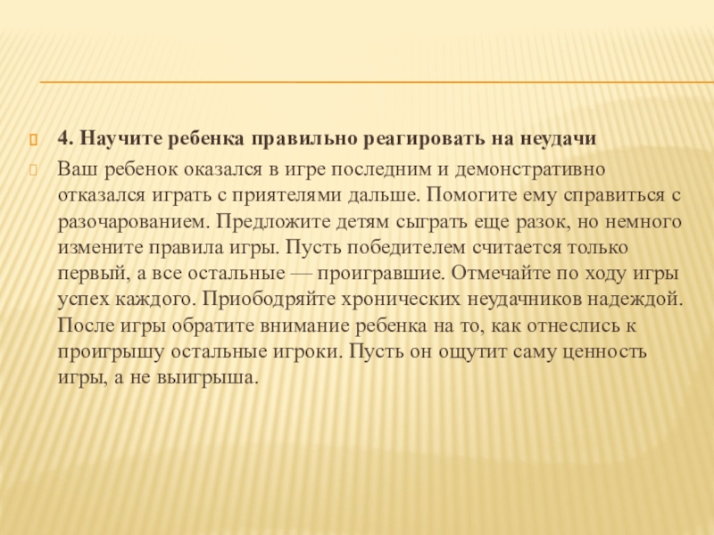 игре последним и демонстративно отказался играть с приятелями дальше. Помогите ему справиться с разочарованием. Предложите детям сыграть еще разок, но немного измените правила игры. Пусть победителем считается только первый, а все остальные — проигравшие. Отмечайте по ходу игры успех каждого. Приободряйте хронических неудачников надеждой. После игры обратите внимание ребенка на то, как отнеслись к проигрышу остальные игроки. Пусть он ощутит саму ценность игры, а не выигрыша.