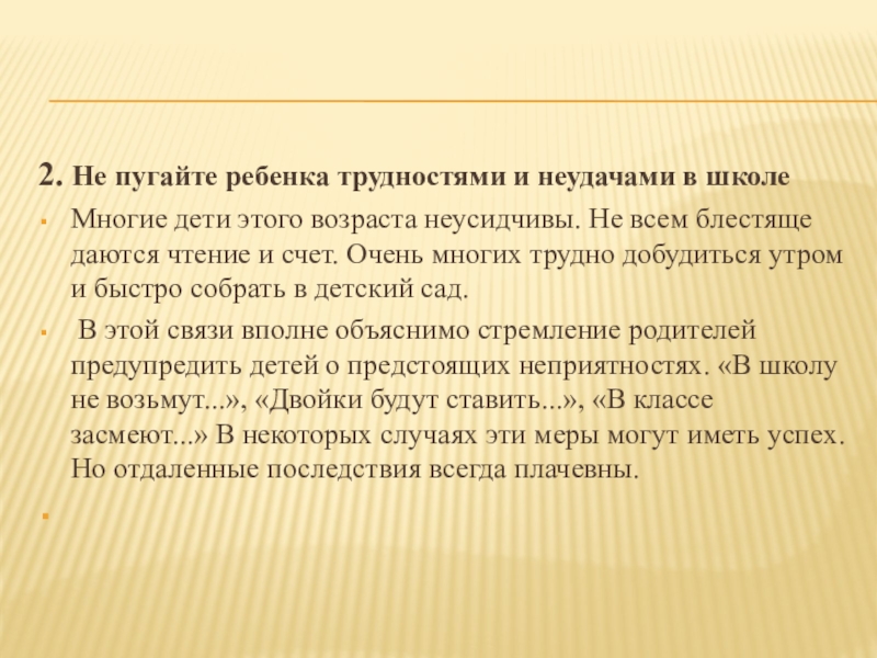 Слайд 112. Не пугайте ребенка трудностями и неудачами в школе