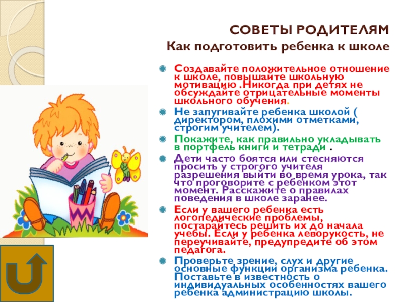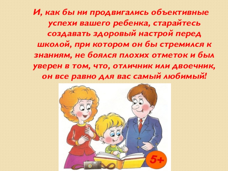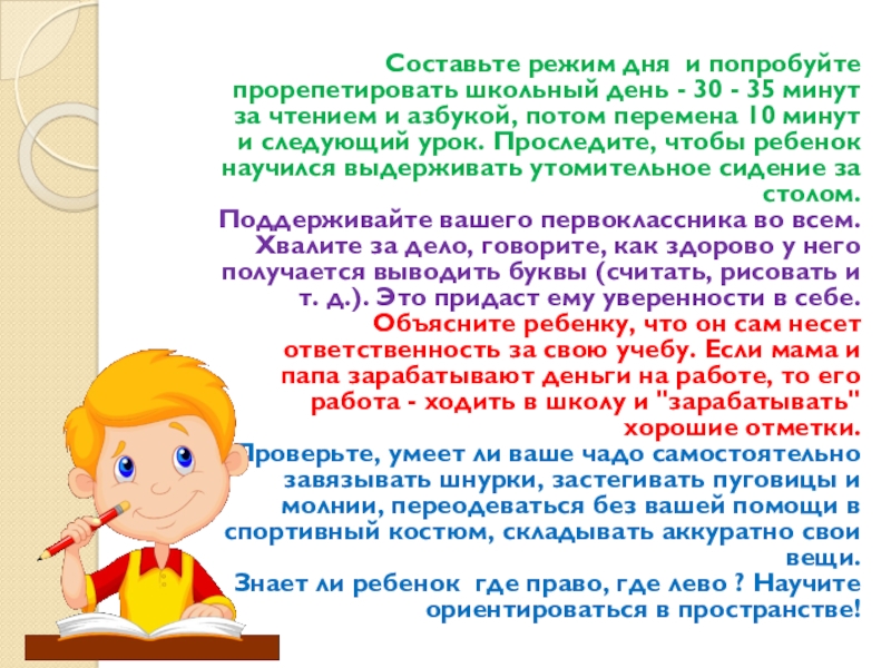 Поддерживайте вашего первоклассника во всем. Хвалите за дело, говорите, как здорово у него получается выводить буквы (считать, рисовать и т. д.). Это придаст ему уверенности в себе.