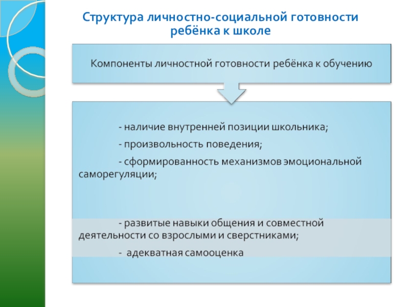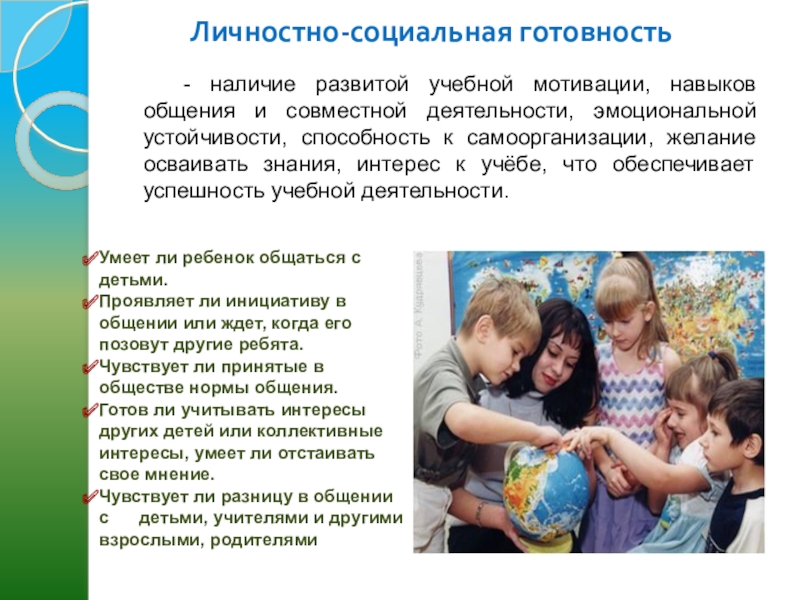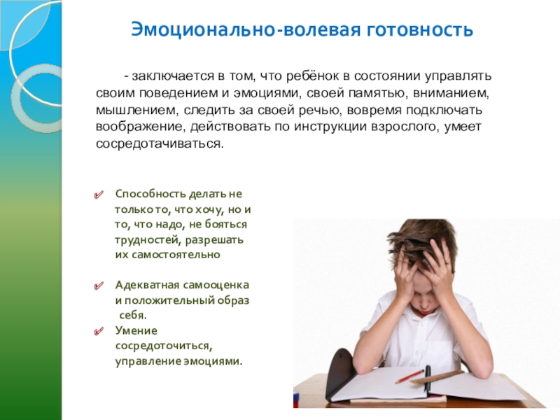 Ребёнок, готовый к школьному обучению, хочет учиться, поскольку стремиться занять определённую позицию в обществе, дающую возможность включиться в мир взрослых, а так же потому, что у него развита познавательная потребность, которая не может быть в полной мере удовлетворена дома.