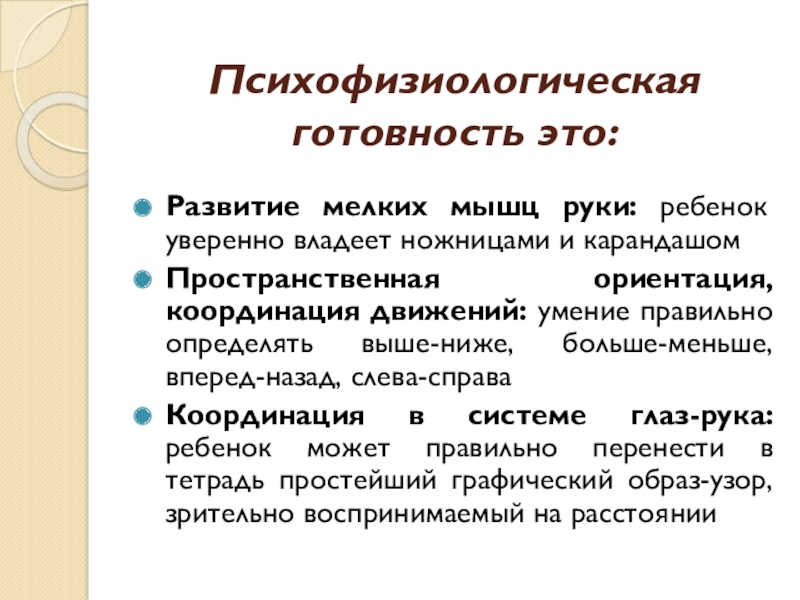 Координация в системе глаз-рука: ребенок может правильно перенести в тетрадь простейший графический образ-узор, зрительно воспринимаемый на расстоянии