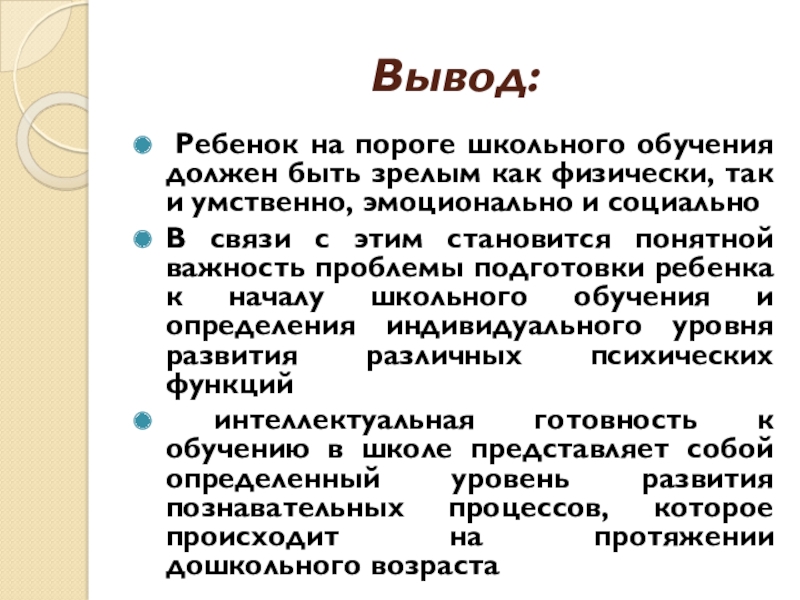 В связи с этим становится понятной важность проблемы подготовки ребенка к началу школьного обучения и определения индивидуального уровня развития различных психических функций