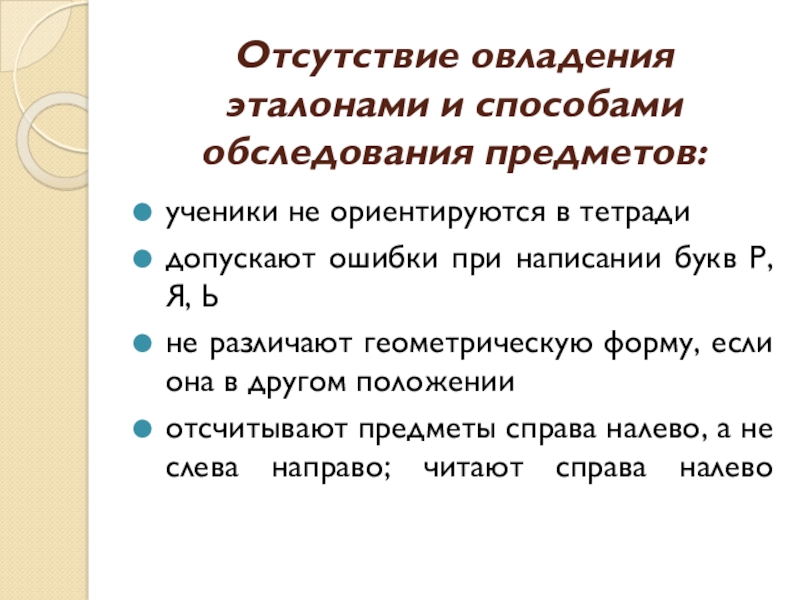 Слайд 10Отсутствие овладения эталонами и способами обследования предметов: