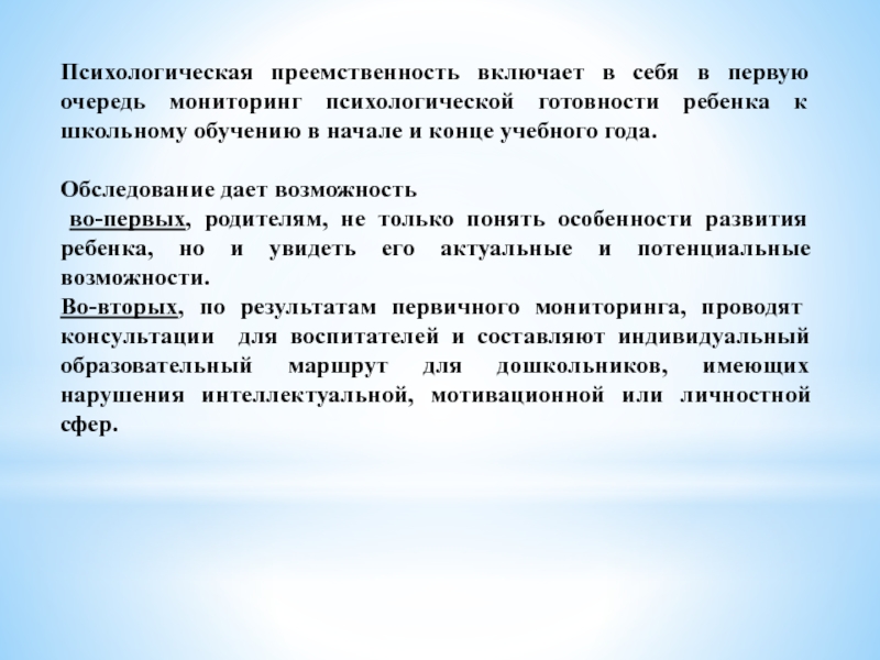 Слайд 9Психологическая преемственность включает в себя в первую очередь мониторинг психологической готовности