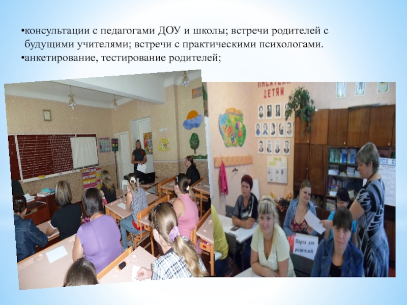 Слайд 12консультации с педагогами ДОУ и школы; встречи родителей с будущими учителями;