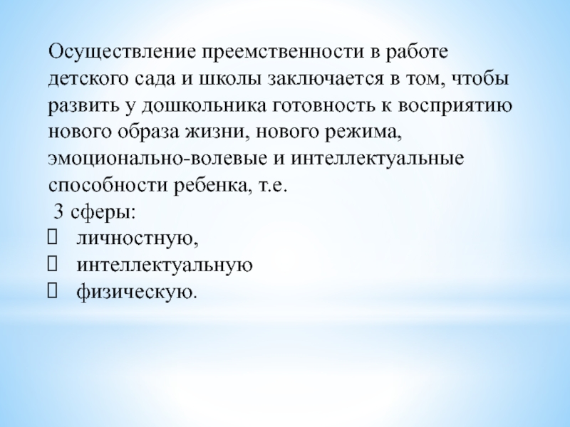 Слайд 7Осуществление преемственности в работе детского сада и школы заключается в том,