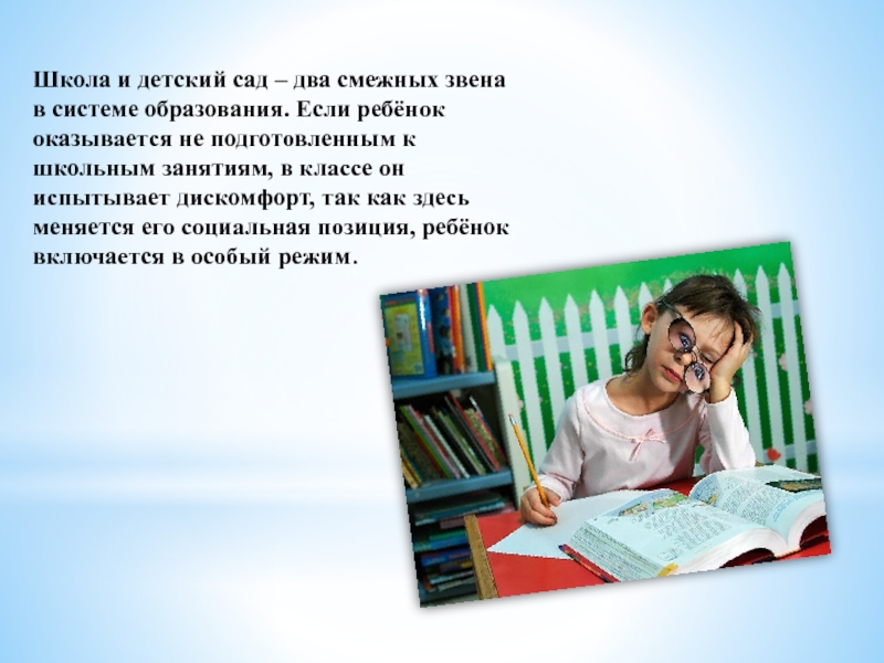 Если ребёнок оказывается не подготовленным к школьным занятиям, в классе он испытывает дискомфорт, так как здесь меняется его социальная позиция, ребёнок включается в особый режим.