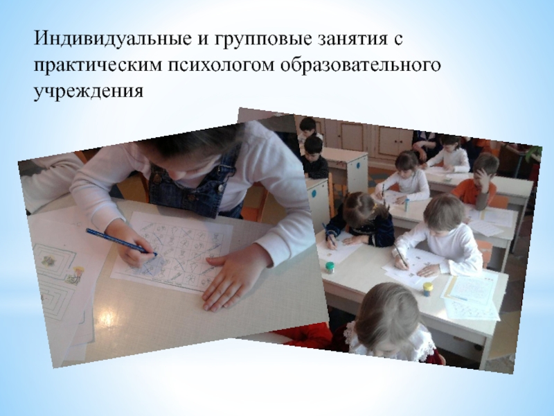 Слайд 18Индивидуальные и групповые занятия с практическим психологом образовательного учреждения
