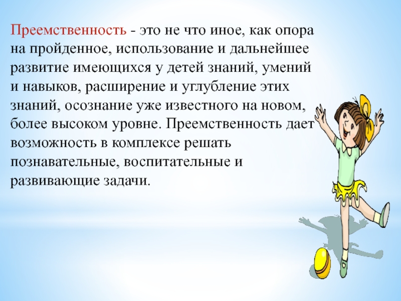 и дальнейшее развитие имеющихся у детей знаний, умений и навыков, расширение и углубление этих знаний, осознание уже известного на новом, более высоком уровне. Преемственность дает возможность в комплексе решать познавательные, воспитательные и развивающие задачи.