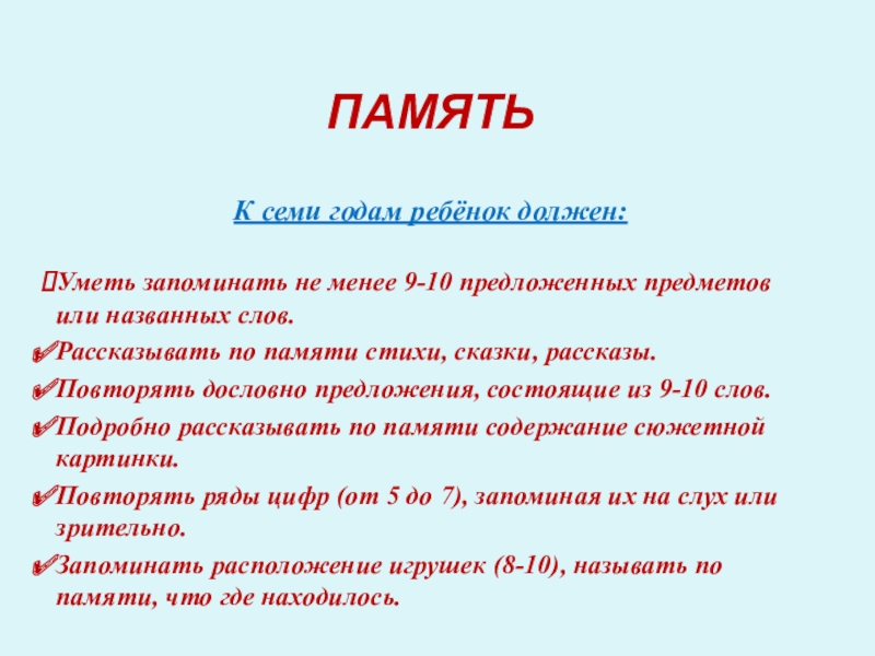 Уметь запоминать не менее 9-10 предложенных предметов