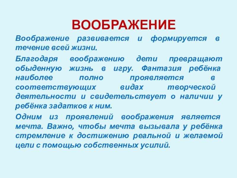 Одним из проявлений воображения является мечта. Важно, чтобы мечта вызывала у ребёнка стремление к достижению реальной и желаемой цели с помощью собственных усилий.