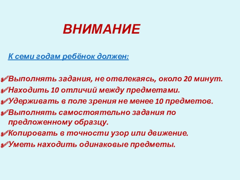 внимания, работоспособности, темпа и целенаправленности деятельности.