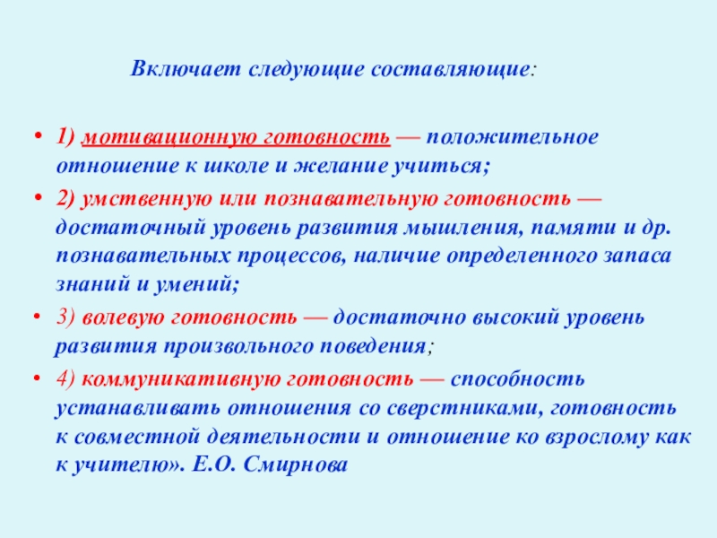4) коммуникативную готовность — способность устанавливать отношения со сверстниками, готовность к совместной деятельности и отношение ко взрослому как к учителю». Е.О. Смирнова