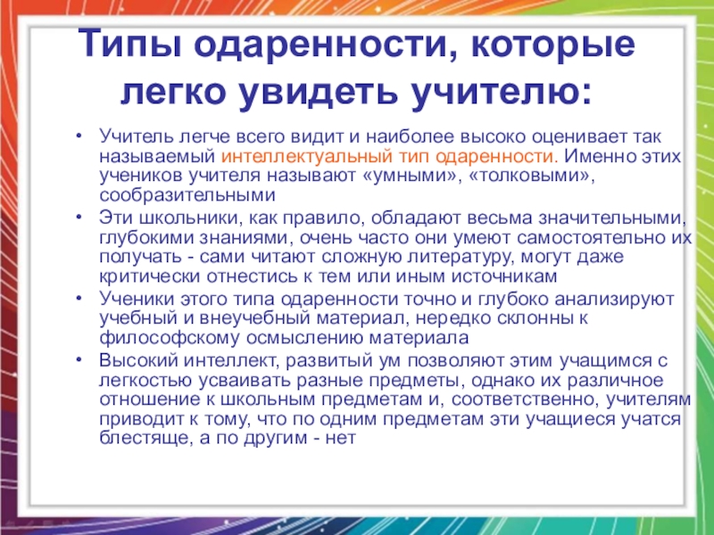 Слайд 4Типы одаренности, которые легко увидеть учителю: