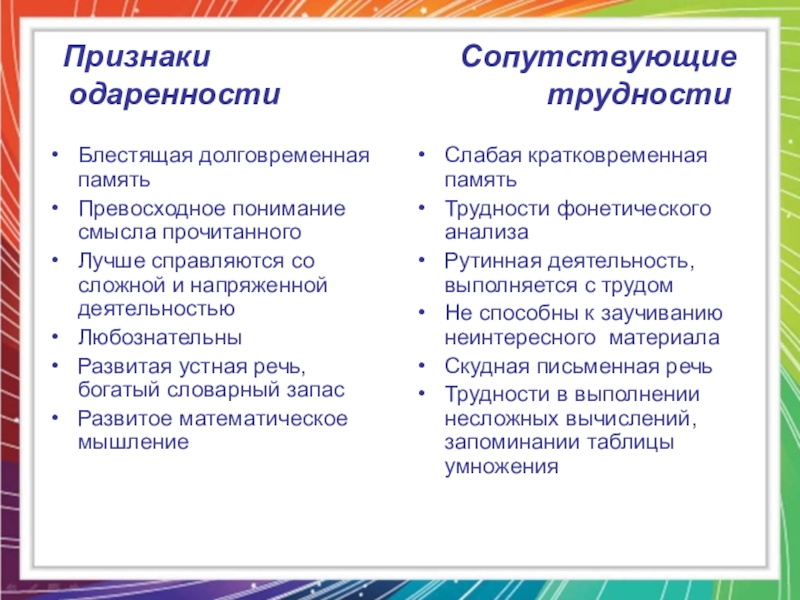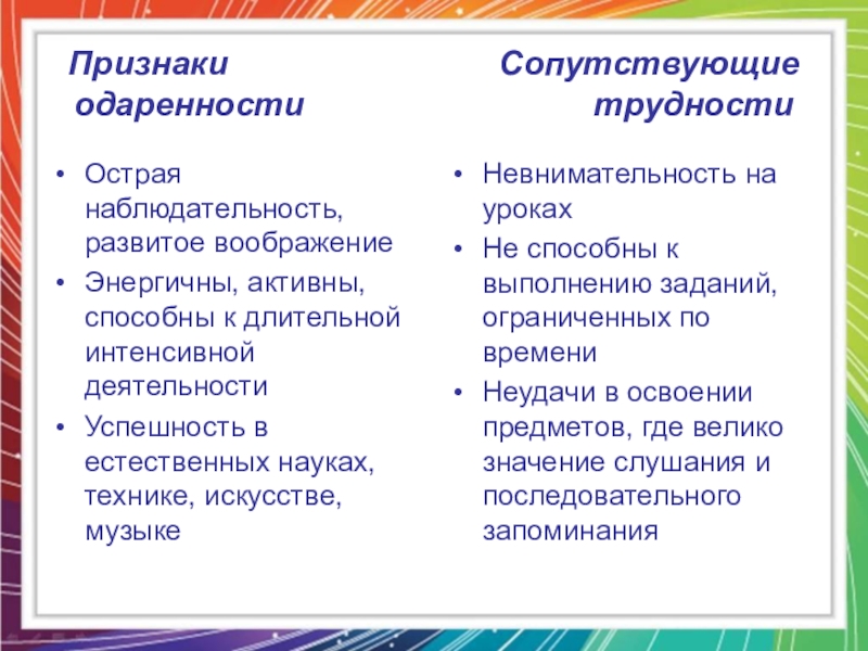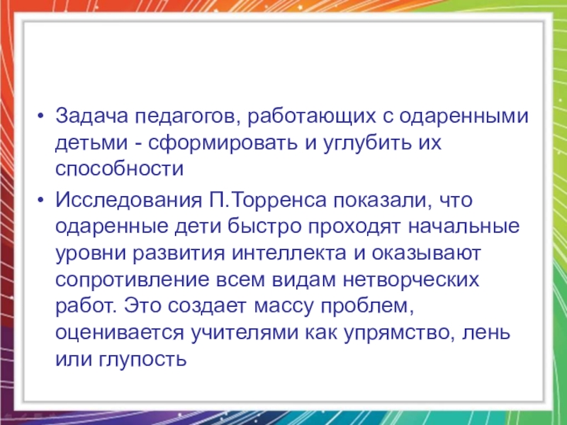 Исследования П.Торренса показали, что одаренные дети быстро проходят начальные уровни развития интеллекта и оказывают сопротивление всем видам нетворческих работ. Это создает массу проблем, оценивается учителями как упрямство, лень или глупость