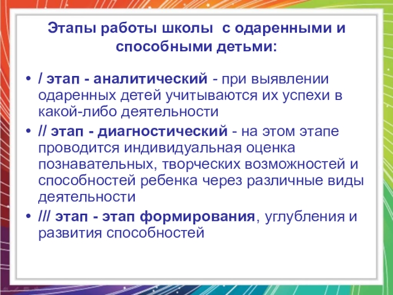 Слайд 17Этапы работы школы с одаренными и способными детьми: