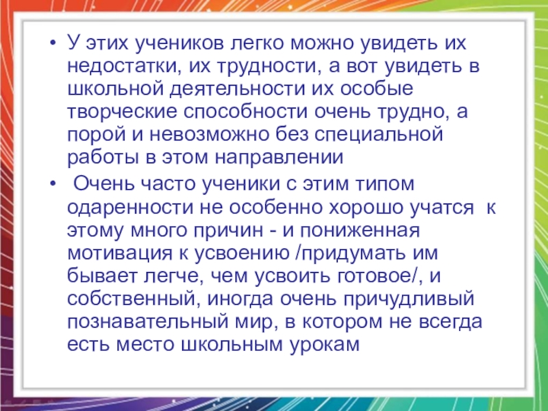 Очень часто ученики с этим типом одаренности не особенно хорошо учатся к этому много причин - и пониженная мотивация к усвоению /придумать им бывает легче, чем усвоить готовое/, и собственный, иногда очень причудливый познавательный мир, в котором не всегда есть место школьным урокам