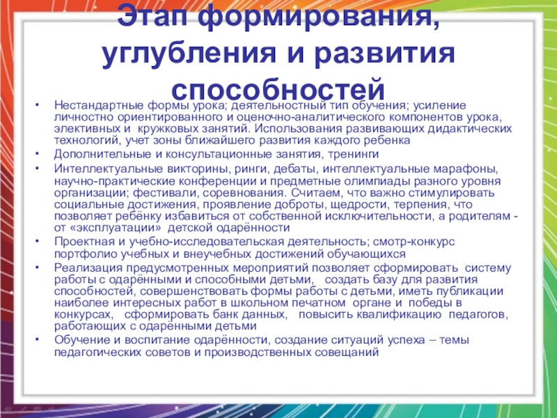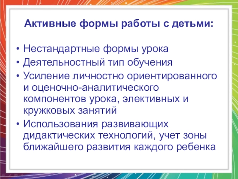 обучения; усиление личностно ориентированного и оценочно-аналитического компонентов урока, элективных и кружковых занятий. Использования развивающих дидактических технологий, учет зоны ближайшего развития каждого ребенка